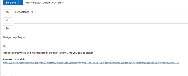 For questions about the design of buildings at draft or quote stage, you would email an Export Quote link to the Assistance team at assistance@steelx.com.au. If you are unsure of where to send the request, email it to support@steelx.com.au.