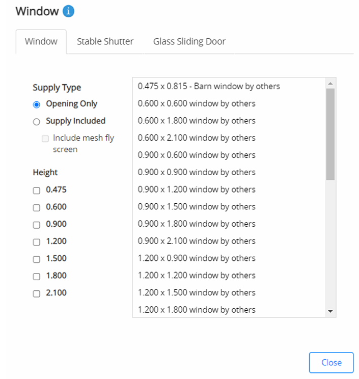 The Windows and GSD’s feature in SMS allows users to select and place openings using a tabbed list and tick box selection process.