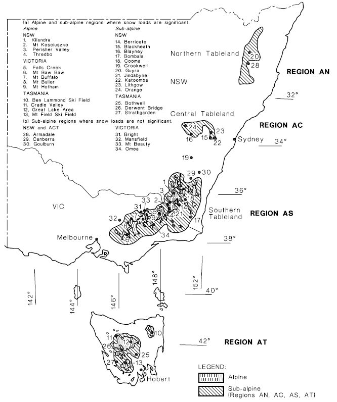 Snow loading is present in Wind Region A. Alpine and sub-alpine regions are defined as follows: