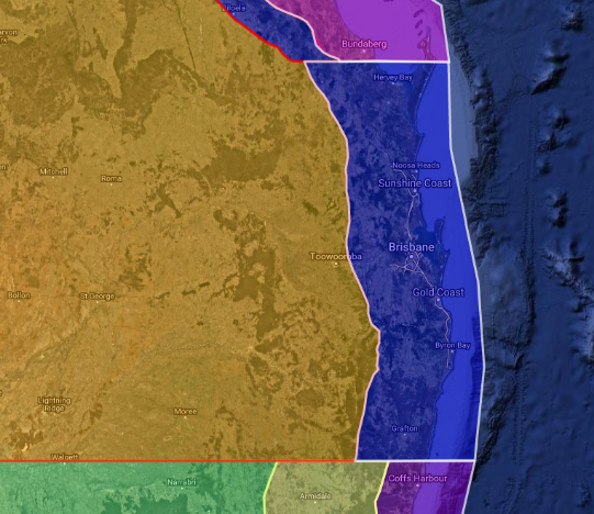 Region B follows behind Region C along the Australian coastline from Grafton, NSW, over the top of Australia to Leeman in WA.