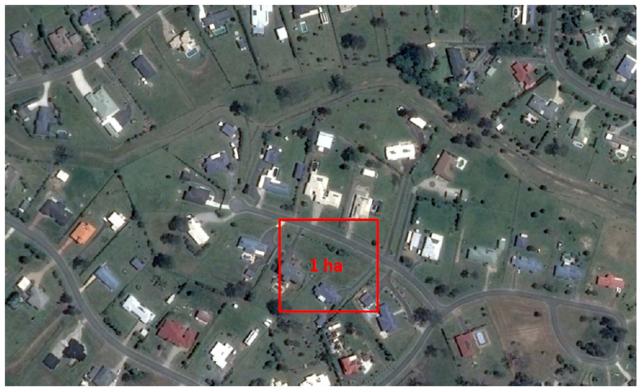 - Small acreage subdivisions with fewer than 1 house per 1,000 m² (or 10 per hectare)