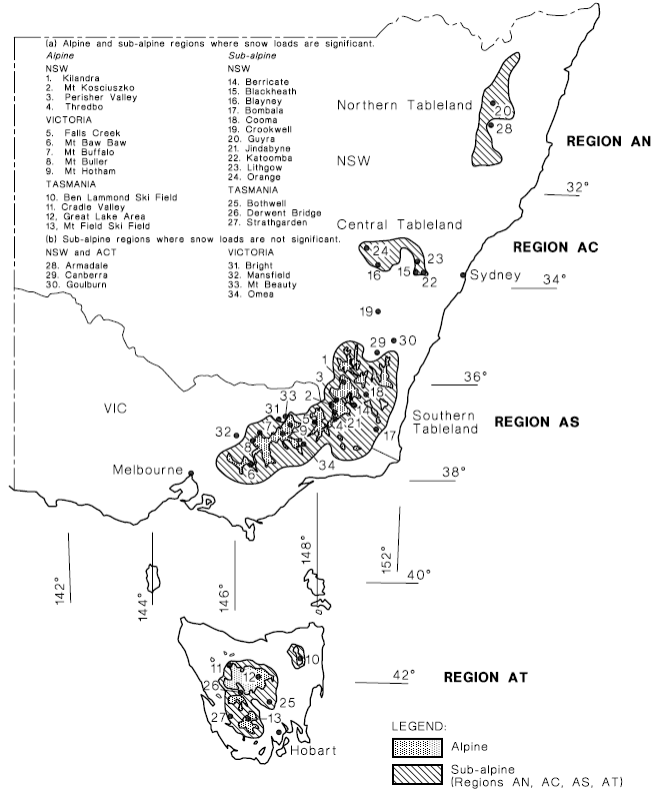 Snow A – Snowload is present within Wind Regions A. Alpine and sub-alpine regions are defined by altitude: